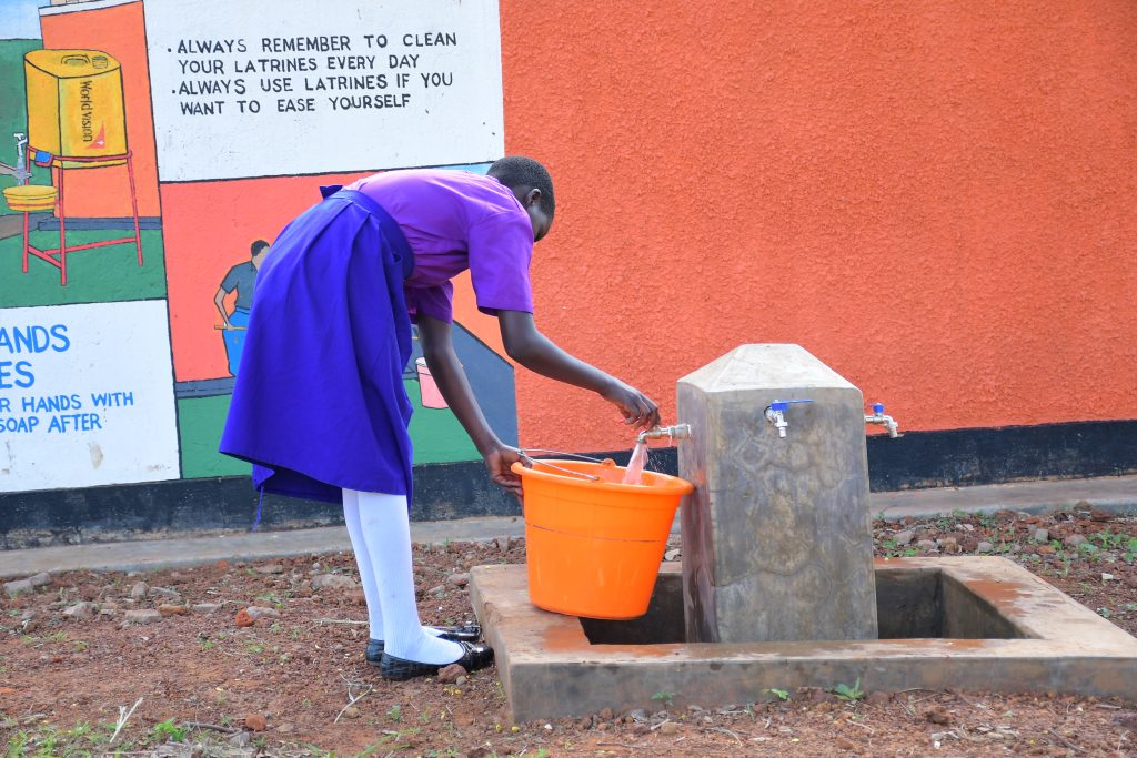 Awach Primary School student fetches water from water facility donated by Absa in partnership with World Vision, in 2024