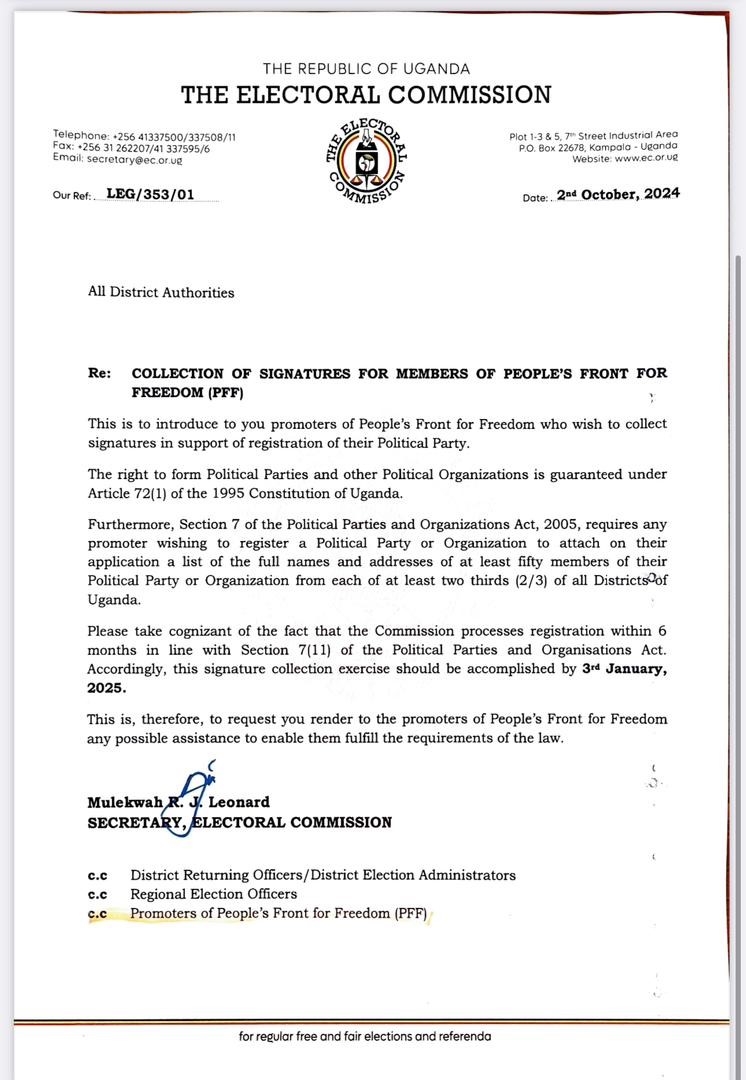 A letter seen by the publication, from the Secretary of the EC, Leonard Mulekwa, dated October 2, 2024, urges all district authorities to provide any necessary support to the promoters of PFF to help them comply with legal requirements.