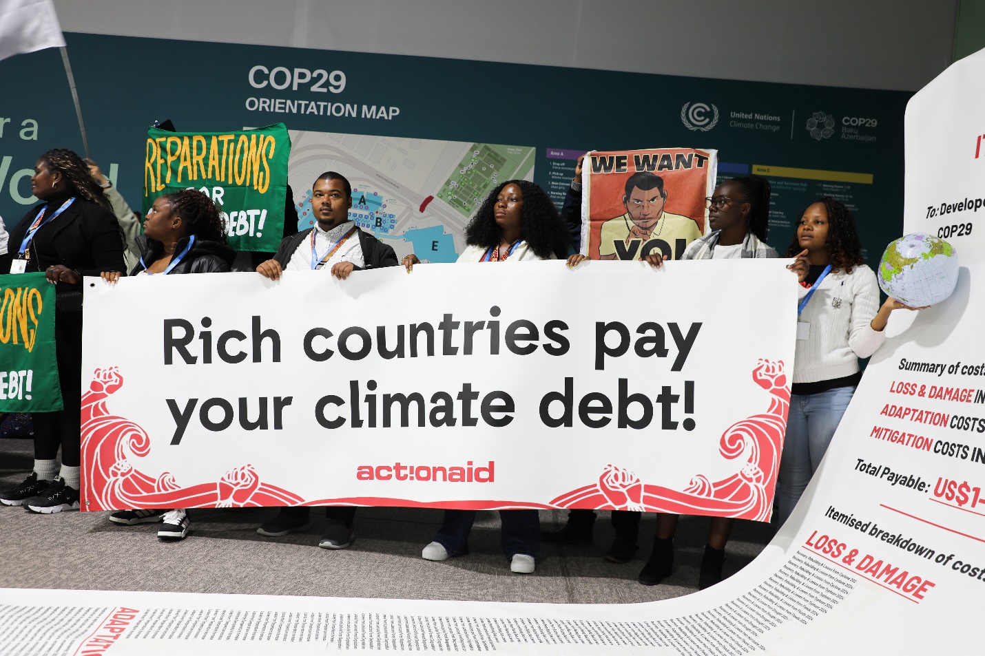 While holding up a 10m-long ‘invoice’ and banners, activists from ActionAid, APMDD, CAN, and DCJ, called on Global North governments to agree to a strong climate finance goal of trillions a year in public funds.