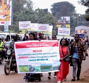 The group, which included three women and two men, carried placards and banners urging action to protect the Lwera Wetland from Chinese exploitation.