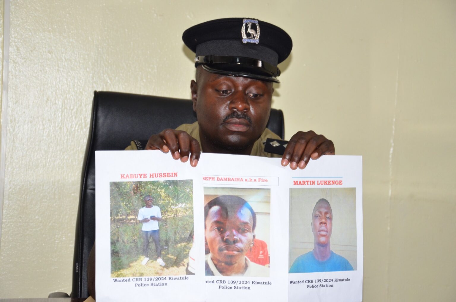 He also mentioned that three additional suspects identified as Hussein Kabuye, Joseph Bambaiha (alias Fire), and Martin Lukenge are still at large.