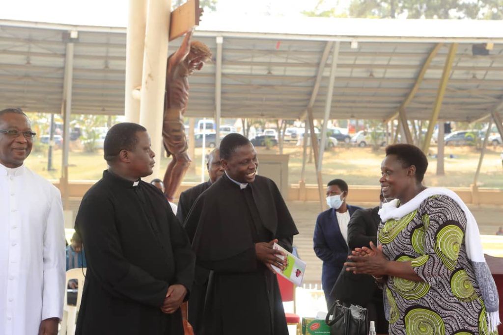 The vice president Maj. (Rtd) Jessica Alupo being received by the Preacher of the day Rev. Fr. Denis Yiga , the Youth Chaplain, Kampala Archdiocese for the World Women's Day Prayers at Uganda Martyrs Namugongo today 7th March 2025