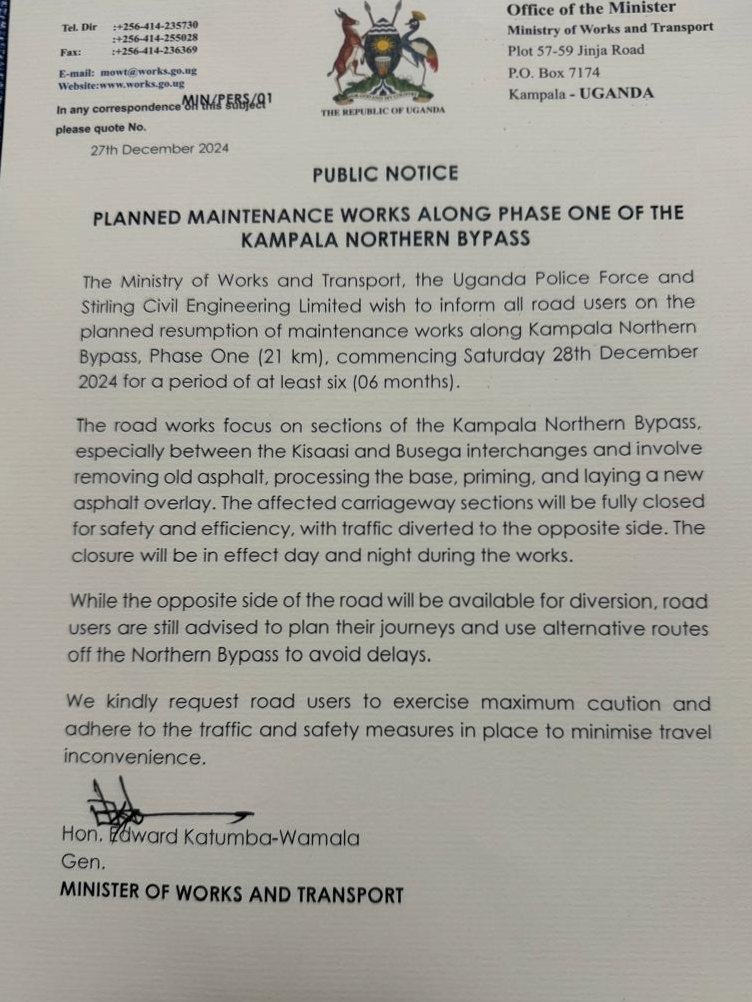 According to a statement issued by the Minister of Works and Transport, Gen. Katumba Wamala, the project is set to commence on December 28, 2024, and will last for six months.