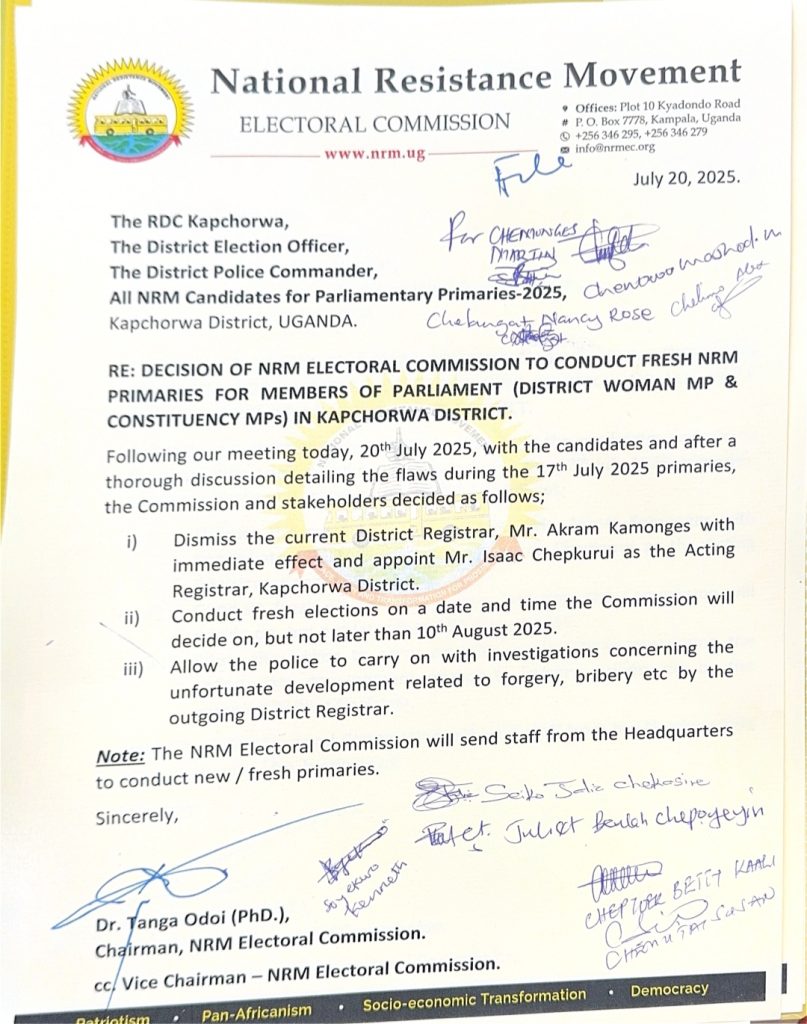 The National Resistance Movement (NRM) Electoral Commission has nullified the election results for Kapchorwa District following widespread irregularities and has mandated fresh elections to be held before 10th August 2025.
