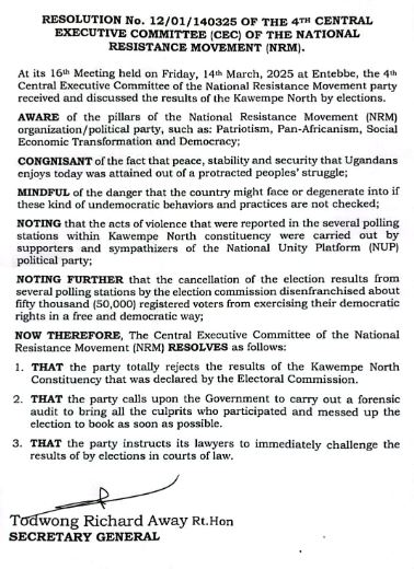 The NRM Central Executive Committee (CEC) has rejected the Kawempe by-election results that were announced on Friday morning. The ruling party’s top organ met yesterday under the chairmanship of H.E. Gen. @KagutaMuseveni and resolved to instruct its lawyers to legally challenge… pic.twitter.com/xpIyzVbMd9