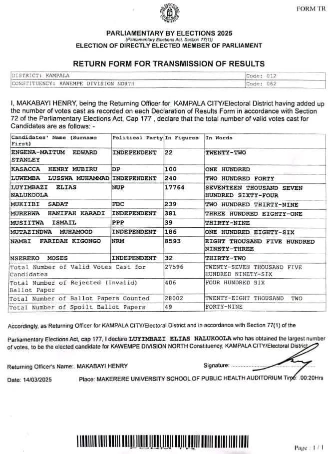 According to Henry Nakabayi, the returning officer for Kawempe North, Nalukoola collected 17,764 votes, far ahead of his nearest competitor, National Resistance Movement (NRM) candidate Nambi Faridah Kigongo, who received 8,593 votes.