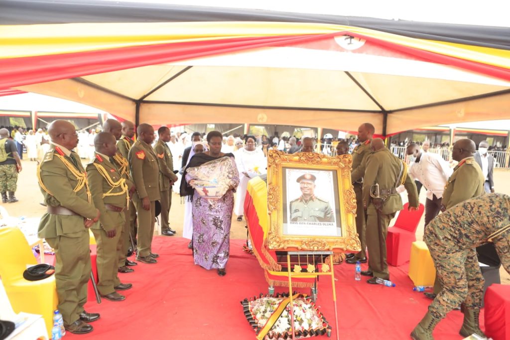 She thanked VP Alupo for proposing that her husband be buried today, Sunday, February 8th, to allow thousands of mourners to pay their tribute to Gen. Oluka. She thanked ISO and the UPDF in fraternity for giving her husband a conducive atmosphere to work and for turning up in big numbers to send him off.