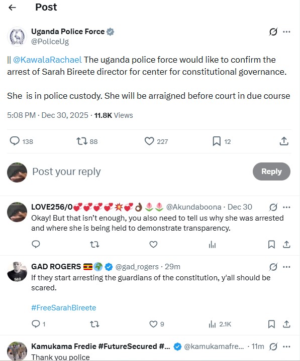 Police spokesperson Rachael Kawala announced the detention on the Uganda Police Force’s official X account (formerly Twitter), stating: “The Uganda Police Force would like to confirm the arrest of Sarah Bireete, director for the Centre for Constitutional Governance. She is in police custody and will be arraigned before court in due course.”