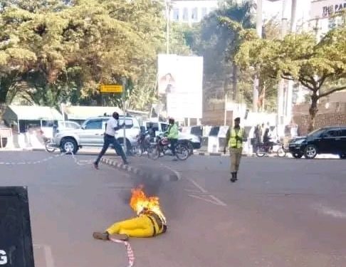 A young man identified as Benjamin Agaba, dressed in the yellow colors of the ruling National Resistance Movement (NRM) party, set himself on fire in a shocking act of desperation along Parliamentary Avenue, just a short distance from August House in Kampala.