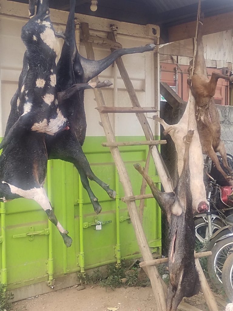 The goats were skinned, with their heads removed and most internal organs taken out.