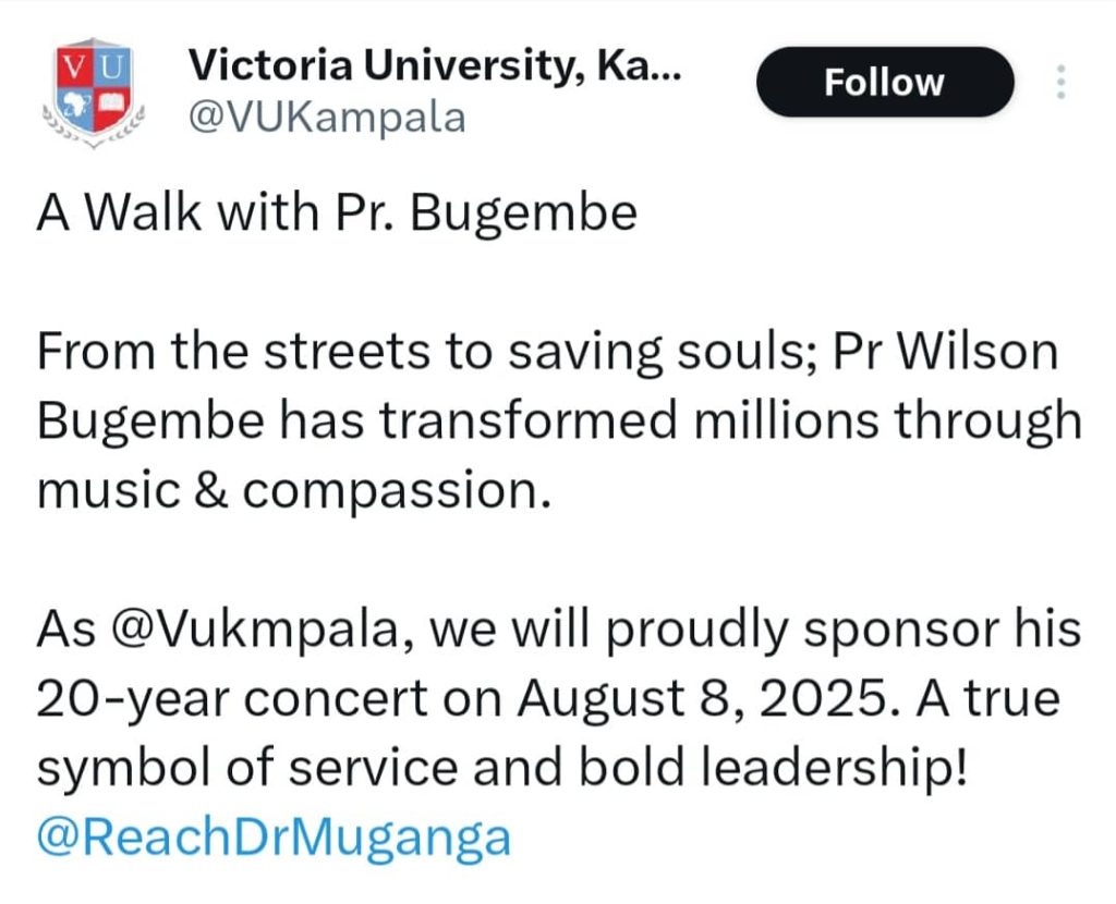 KAMPALA, Uganda — Victoria University Kampala is honored to announce its sponsorship of the highly anticipated 20-Year Celebration Concert by renowned gospel artist and pastor, Wilson Bugembe. The event is scheduled for August 8, 2025, at Kampala Serena Hotel.